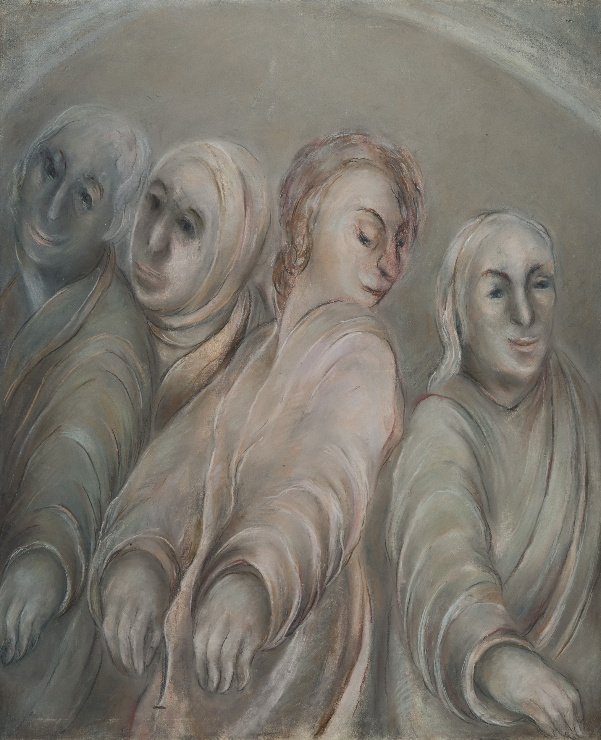 In the works of the Rembrandt Cycle, as it was called by the art critic Mikhail Alpatov, Levina-Rozengolts turned to the idol of her youth, whom she had come to love through Falk, who was himself inspired by the great Dutch artist. Her compositions with human figures are beyond any generic classification. The life-size people depicted in some kind of procession are not connected to each other by any narrative; these figures constitute the human masses, snatched out of the flow of time. They represent condensations of matter, which has been subjected to some kind of “compacting” force, but which, as a unified whole, continues to present resistance. “Prison, the prosecutor, and exile made me into a real artist,” she said. [1] This was how Levina-Rozengolts understood her life; this was how she metaphorically embodied her knowledge of life in her works.