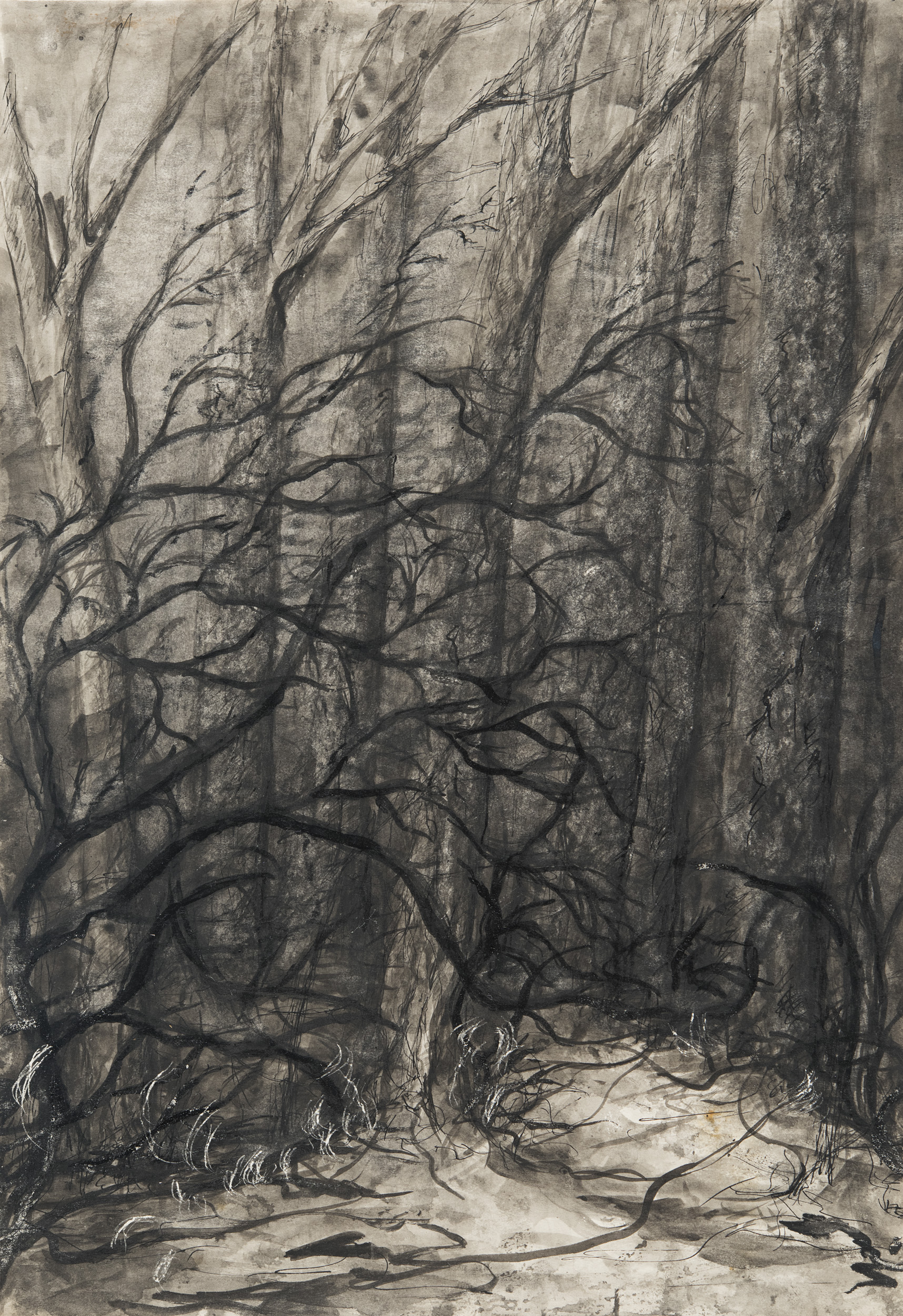 In 1956, with the denunciation of Stalin’s personality cult and the beginning of the Khrushchev-era “thaw,” Levina-Rozengolts was rehabilitated and returned to Moscow. She began working intensively in graphic art, mainly pen and ink on paper. During the late 1950s and early 1960s, she created the cycles that became her artistic calling card: Trees (ZAM, D25280), Swamps (ZAM, D25282), People (Rembrandt Series, ZAM, D25278-79; 2001.1042-44). In these works, she reinterpreted her previous experience: her visual culture was given a sharper, more emphatic expression in recognition of her many years of forced inactivity. Her works were executed without preliminary sketches, alla prima. Her ink drawings were filled with living emotions, a re-experiencing of the past. Images of trees, swamps, and remote locations in nature symbolized loss, bitterness, and pain due to the absence of any place where peace and joy might be found.