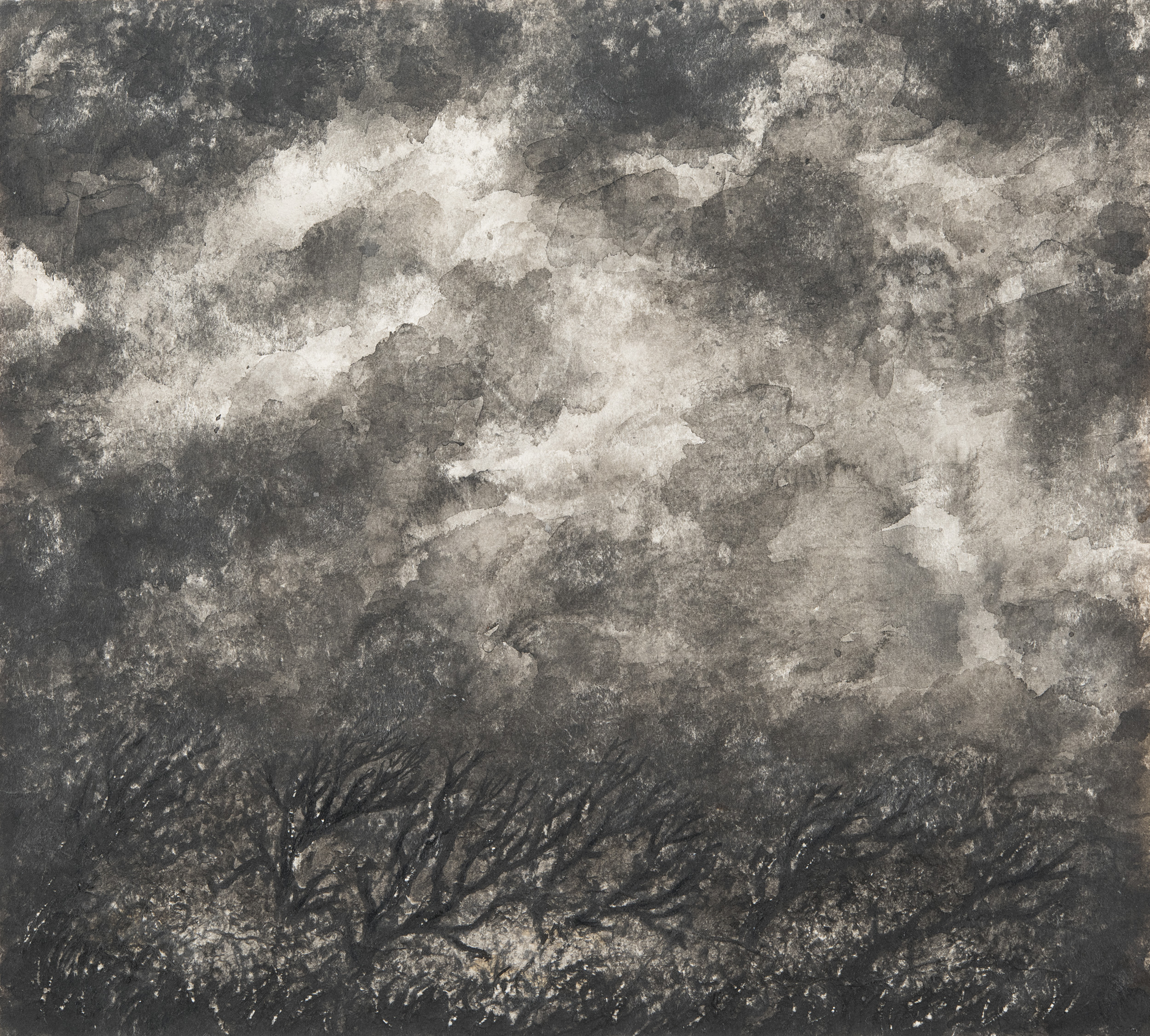 Levina-Rozengolts executed these laconic compositions on large sheets of drawing paper, moving away from the intimate formats of her previous works. The artist achieved a smooth gray-blue textured surface, on which light reflections break through at different angles. The notional designation of the sky is highlighted by rare charcoal inserts, denoting the earth’s solidity, and upward-stretching clumps of plants and grasses—sprouts of life, which serve as decoration for eternal immaterial light. According to the painter Erik Bulatov (1933–2025), Levina-Rozengolts’s Sky cycle had a strong influence on his work. The solution to spatial problems in his compositions of the 1970s, to some extent, had its source in the pastels of his close friend Levina-Rozengolts.