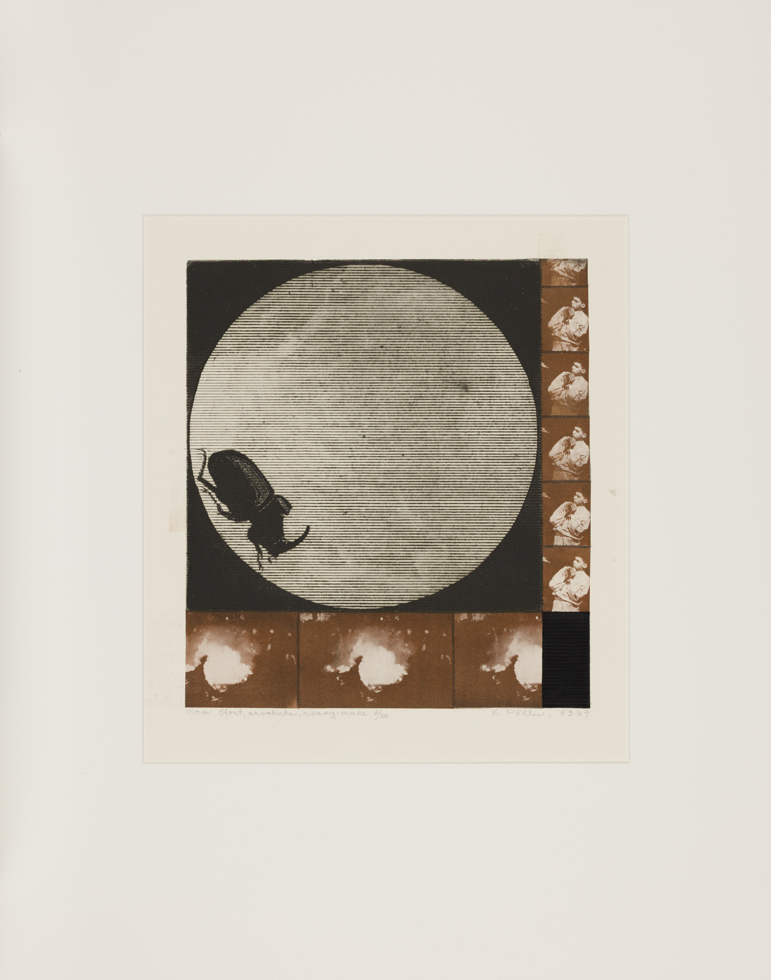 From the mid-1960s, Põllu used pop art techniques in his printmaking, where he combined the picture surface with a series of readymade photoreliefs. In Estonian art, Põllu was the first to use cliché print together with traditional printing techniques. Põllu powerfully emphasized the topicality of the issues reflected in his works and, by shifting the fields of meaning, also opened up complex social subtexts. The first of these was Hirm [Fear] (1967, ZAM, 2000.1296), which used images of insects. In the context of the political events of 1968 in the countries of Eastern Europe, the lack of freedom of expression, and the Iron Curtain, Põllu used insect metaphors to great effect in enclosed spaces and frames, as in Naerev mees [Smiling Man] (ZAM, D18736), Hüpe [Bound] (ZAM, 2000.1294), and Meeleolu [Mood] (ZAM, D18735), all 1971. In a rather unexpected way, Põllu also brought national imagery into pop art, reflecting on the meaning of various nationally charged symbols in society. In his Hingekellad [Bells] (1967, ZAM, 2000.1288), he contrasted a posterlike female face typical of mass culture with a row of pictures of a girl in national costume and chiming church bells.